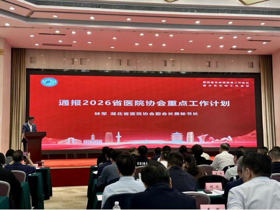 会议第二项,协会副会长兼秘书长林军通报了2026湖北省医院协会重点工作计划,详细阐述了2026年度协会重点工作部署。明确了全年工作的核心任务、实施路径与时间节点,为各分支机构开展工作提供了清晰指引,确保协会全年工作有序推进、落地见效。一是强化党建引领,抓牢自身建设,推进协会高质量发展。二是锚定主责主业,抓实活动开展,筑牢规范办会根基。协会31个分支机构2026年全年计划承办87项活动。三是聚焦重点项目,强化平台引领,精准发挥服务效能。如:4月开展华西研修班;4月至12月举办6场“医管•领航者月度视界”线上会议;5月至12月协会组织专家团队,分别在荆门、黄石、武汉等地市开展线下培训;四是践行公益担当,深化基层帮扶与社会责任。2026年,协会全年计划组织开展基层帮扶活动不少于50场。