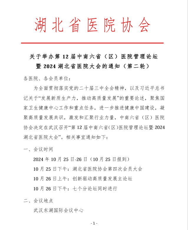 关于举办第12届中南六省(区)医院管理论坛 暨2024湖北省医院大会的通知(第二轮)