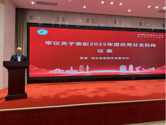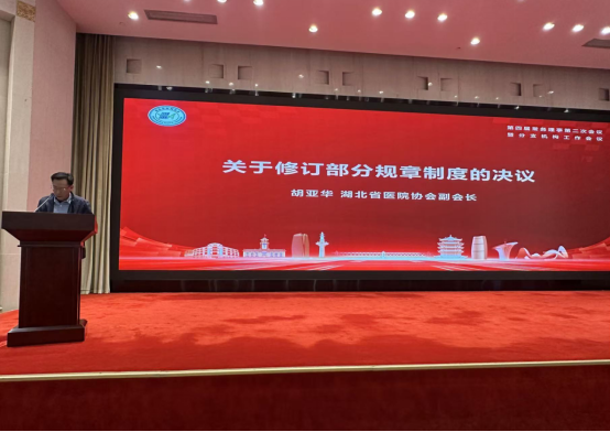 会议第四项,协会副会长郑正春、朱海东、杨学武、徐向阳分别宣读四项决议,明确相关事项落地执行:一是正式修订《湖北省医院协会“三重一大”事项民主议事决策制度》,制定《湖北省医院协会公益活动管理办法》和《湖北省医院协会发文办理程序的规定》;二是确定“2026湖北省医院大会”定于11月13-14日在武汉东湖国际会议中心举办;三是确定湖北省医院协会“2025年度优秀分支机构”名单,并在2026湖北省医院大会上进行表彰;四是会议同意协会租用武汉市东湖路165号省卫健委招待所5楼、6楼共8间房间作为协会办公用房。